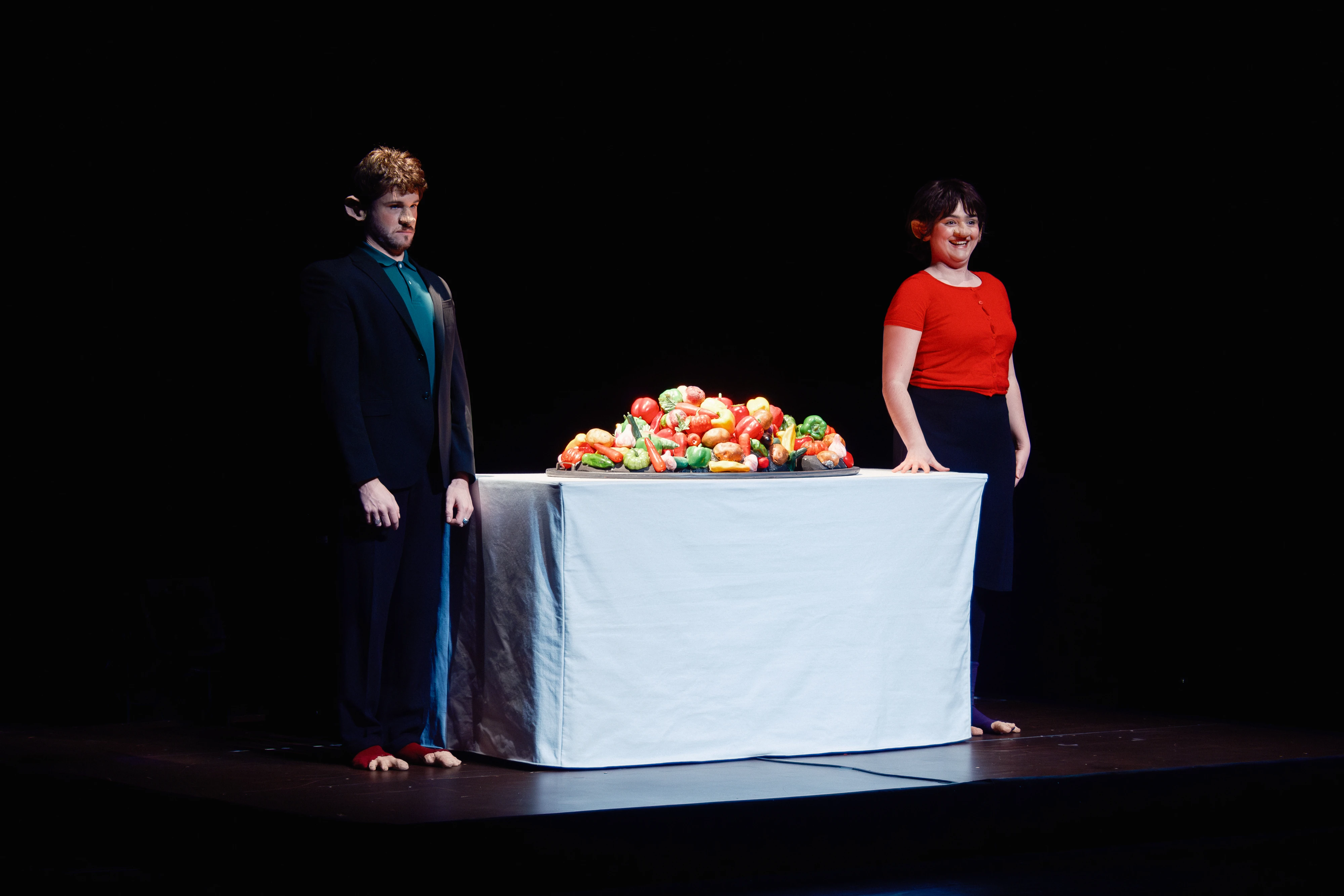Je suis né dans une famille nombreuse où le repas est une affaire sérieuse, sacrée. A table avec mes quatre frères et sœurs, nous sommes contraint.es de rester jusqu’au bout. Les assiettes sont remplies copieusement. Les plats sont toujours terminés jusqu’à la dernière goutte de sauce, et jusqu’aux miettes sur la nappe. C’est à celui qui en mangera le plus : on en oublie le bon sens et on en retrouve nos instincts animaux. Nous cherchons tous à combler notre vide. Nous sommes autour de la table victimes du même mal, notre ventre a un trou et rien ne peut nous arrêter de manger. Cela fait quelques années que j’observe les appétits et leurs connexions aux émotions, notamment au sein de la cellule familiale. Rapidement la forme du conte s’est imposé à moi, me permettant de proposer un récit ouvert aux interprétations et à des sensibilités plurielles. Le merveilleux et la magie alliés à l’humour et l’absurde me permettent d’aborder en filigrane le lien entre émotions et comportement alimentaire et une forme de rapport familial abusif.